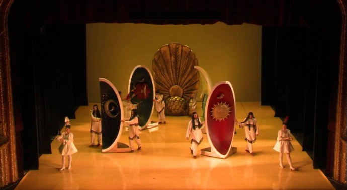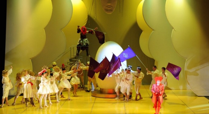 Bellone, zeița războiului, interpretată de un bariton, rupe impetuos vraja al­burie în tușe de roșu electric și în su­net de trompetă, spărgînd Oul în patru e­lemente: soare, lună, flori și cîmp. Așa că îndrăgostiților aruncați în de­ri­vă nu le rămîne decît să plece în că­utarea lor, care încotro, spre tărîmuri e­­xotice. Zeul Amor intervine, în­dem­nîndu-i pe tineri cu acorduri orientale îmbietoare să profite de dragoste, în ciu­da căderii din Rai și din grație. Eu­ro­pa cea măcinată de ură și confruntări es­te părăsită definitiv de cei care își caută împlinirea în pofte nestăvilite de mări sau de vulcani.