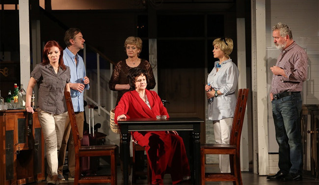 Comedia neagră „Acasă în mie­zul verii”, jucată vineri, 16 mai în Sa­la Mare a Teatrului Naţional „Va­si­le Alecsandri” din Iaşi, în versiunea sce­nică a lui Claudiu Goga, urmărește povestea familiei Weston. Acțiunea începe după ce capul familiei, Be­ver­ly Weston, fost poet celebru, de­ve­nit alcoolic, s-a sinucis. Forțat de îm­pre­jurări, neamul dominat de femei pu­ternice, ale căror vieți au mers pe căi diferite pînă în momentul în­mor­mîn­tării, se reîntoarce în orașul natal. Cu o distribuție din care fac parte Emil Co­șeru, Mihaela Werner sau Doina Cărăuleanu, și un decor foarte bine realizat, scenariul a părut totuși des­prins dintr-o telenovelă sud ame­ri­ca­nă, cu conflicte permanente între per­sonaje și întorsături de situație une­ori exagerate. Cu toate acestea pu­bli­cul a fost captivat de poveste și doar izbucnirile în rîs ori tresăritul din mo­mentele de tensiune a mai adus cî­te un murmur din partea spec­ta­to­ri­lor.
