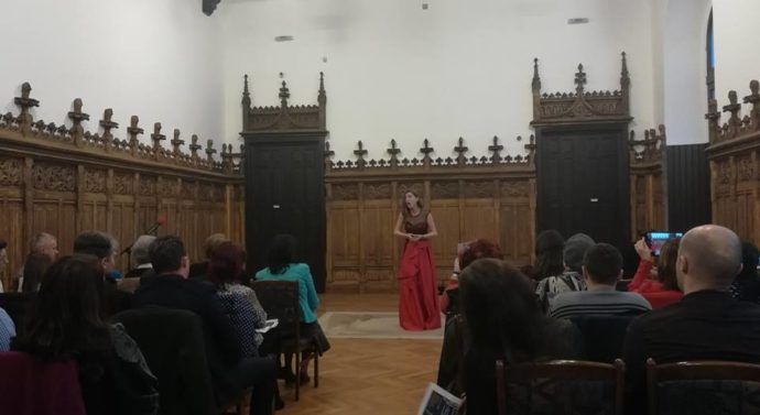 Debutul spectacolului a fost fă­cut de un grup de elevi de clasa a XI-a, care au pregătit o serie de poezii, pe care nu le-au spus cu v­o­cea tremurată, ci le-au recitat cu intonație, folosind gestica și mi­mi­ca, pentru a-i face pe cei din sală să simtă profunzimea versu­rilor. Emoțiile s-au văzut însă cînd unii dintre ei își uitau mîinile în buzunare pe tot parcursul momentului pregătit, cînd se legănau de pe un picior pe al­tul sau cînd au avut nevoie de în­curajările celor din sală pentru a putea să-și amintească versurile. Colajul de poezii, împărțit pe trei părți care au fost intercalate cu piese ale elevilor care studiază can­to, i-a făcut pe cei prezenți să su­rîdă la degajarea cu care tineri – ce încă nu au împlinit 18 ani, in­ter­pretează cuvintele.