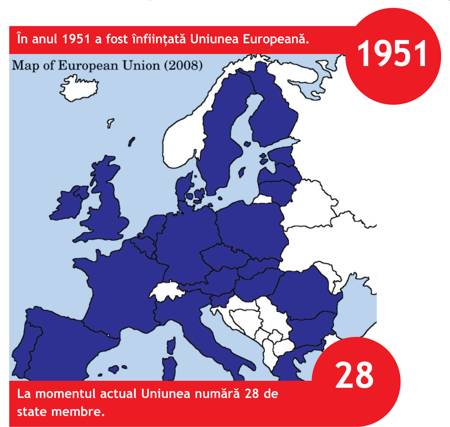 Războaiele din prima jumătate a secolului al XX-lea, care au că­pă­tat valențe globale, păreau să ză­dărnicească ideile progresiste și să lase în urmă doar distrugere și pier­deri de vieți omenești. Lipsu­rile și disperarea apărute după cel de-Al Doilea Război Mondial au reanimat ideea de punere în co­mun a forțelor proprii pentru crea­rea unei mari puteri, care să aibă propriile libertăți și obligații. Trep­tat, la acordul semnat de cele șase țări fondatoare (Belgia, Ger­mania, Franța, Italia, Luxemburg, Olan­da) în 1951 s-au alăturat alte 22. A­cum, Uniunea Europeană (UE) în­su­mează 28 de țări care au sub um­brela lor protectoare 500 de milioane de cetățeni liberi. Deviza UE – ,,Unitate în diversitate” – în­tru­chi­pează conceptele care o de­fi­nesc: ideile democratice, egalitatea în șan­se, menținerea unor relații a­mi­a­bi­le între națiuni, securitatea ce­­tă­țe­nilor, încurajarea diversității la ni­vel cultural în contextul glo­bali­ză­rii și ajutor economic între sta­tele membre.