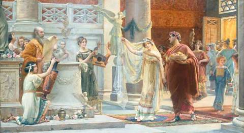 Pe de altă parte, la romani, purtarea rochiei albe avea o motivație bazată pe mitologie. Albul era culoarea preferată a zeului Hymen, zeu al fertilității și al căsătoriei. Legendele țesute în jurul său spuneau că salva fetele răpite de pirați și le aducea înapoi la familiile lor. Însă zeul nu făcea acest lucru gratuit, ci punea o condiție părinților fetei scăpate: să o dea de nevastă celui pe care ea îl iubește. Reprezentările grafice ale zeului îl înfățișau îmbrăcat într-ohaină de culoare albă pe care erau brodate flori, de aici provenind și portul mireselor. Se credea că, purtînd o rochie de culoare albă, mireasa aducea un tribut lui Hymen, care urma să binecuvinteze căsnicia ei.