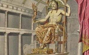 Construită în jurul anului 435 î. Hr., statuia lui Zeus din Olympia, una dintre cele șapte minuni ale lumii antice, a fost distrusă, se pare, în secolul al V-lea d. Hr. Nu s-a păstrat nicio imitație, forma, dimensiunile și detaliile care se știu pînă în ziua de astăzi fiind aflate din scrierile și de pe monezile grecești din acea perioadă. Datorită ei, în Olympia a fost atras un număr mare de vizitatori care aduceau ofrande valoroase și obiecte de artă cum ar fi statui ale altor zei sau vase scumpe, care au intrat în trezoreria orașului, transformîndu-l într-un important centru cultural grecesc.