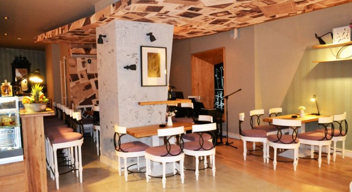 Te strecori sub pălărioara maronie de deasupra ușii, privești fugar la pisoiul desenat cu cretă pe tăblia de la intrare și deschizi ușa ca și cînd te-ai băga sub o plapumă moale. Îți plimbi ochii printre scaunele alb-violet și pe după pilonul din mijlocul încăperii, care ține loc de bar pentru cei care nu și-au găsit încă loc la masă. Volumul muzicii e numai bun, iar piesele sînt calme dar îndeajuns de ritmate încît să nu aibă efectul invers al cafelei ce aburește în cești. Rămîi cu siguranță treaz pentru că te fură plafonul tapetat cu pagini de ziare vechi, bicicleta așezată în nișa unui perete și scările în spirală ce duc spre un separeu cu canapele, la demisol.