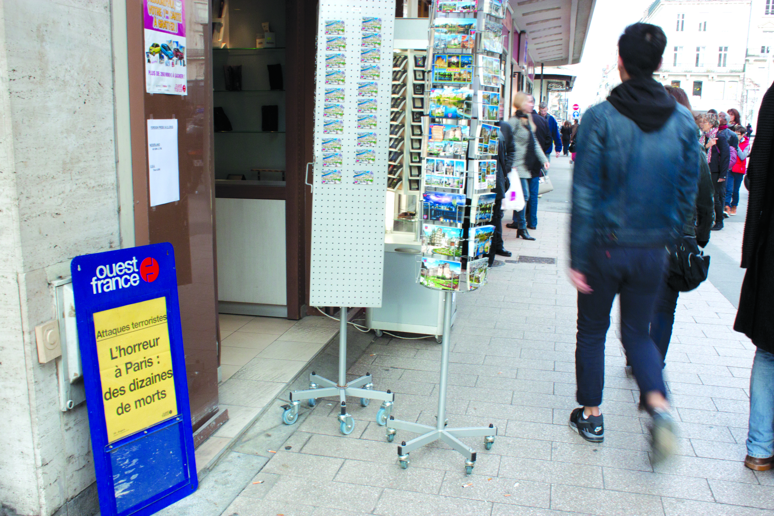 Cea mai mare aglomerație este în centrul comercial, lumea intră și iese din magazine fără multe cum­pă­rături. Luminile de Crăciun au început să fie instalate pe toate stră­zile principale, dar globulețele sus­pendate nu reflectă decît un cer gri. Cei mai mulți cumpără lumînări de la colțul străzii, nu pentru decor, ci pentru a le aprinde pe scările Tea­tru­lui „Le Grande Théâtre d’An­gers” ca semn de solidaritate cu victimele din Paris. Unii lasă și me­saje scrise pe foi de carnet sau de­se­ne cu simbolurile naționale. Din­tre cele mai răspîndite sînt: „ca pa­cea să triumfe în această lume… roa­gă-te pentru PARIS”; „ei nu au murit, ei sînt eroii noștri”; „nu ne este frică, noi sîntem puternici”, „Trăiască Franța!”