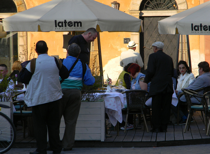 În centrul vechi poți să te pierzi cu orele. Fie că mănînci o porție sănătoasă de bigos sau pierogi sau te întinzi la beri Żubr și Żywiec într-o pivniță de bar un­deva la subsolul vreunei clădiri, me­reu e plin de oameni; și cu fie­ca­re păhărel de Żubrówka, nea­pă­rat Bison Grass, începi să-i în­dră­gești mai tare și cu fiecare Warka la țap nu-ți mai vine să pleci de-aici. Pentru cîțiva zloți poți să te urci într-un turn cu prea multe scări circulare pentru cîtă bere se bea în zonă și să vezi frumoasa pia­ță de pe Krakowskie Przed­mieś­cie, unde cinci lăutari cu tube și trompete cîntă ce vrei tu, de la valsuri la muzică de circ la me­lo­diile din Nașul și Zorba Grecul. Ne așezăm și noi pe-o bancă să as­cultăm cîteva melodii și să bem o bere palmată, după care trecem pe lîngă băieți și le aruncăm un zlot și ceva mărunt în pantoful în care strîng bani. Tinerii cu baloane de lîngă, a căror afacere nu prea mer­ge, ne aruncă vreo două priviri urî­te.