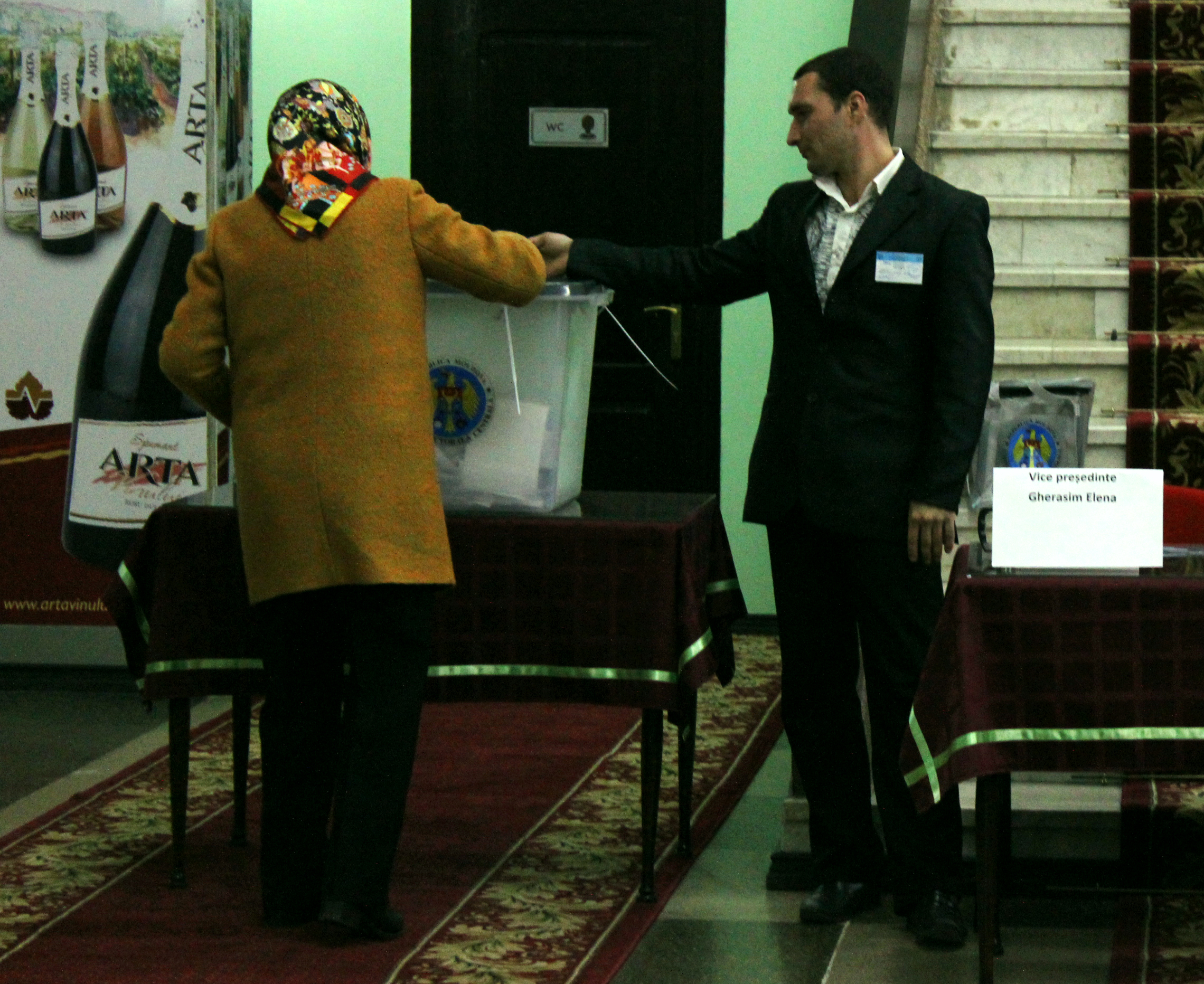 Este pentru prima dată din 2000 cînd moldovenii își aleg pre­șe­din­tele prin vot direct, lucru care a con­­tribuit la entuziasmul lor în ziua votului. Duminică, la prînz, șefii sec­țiilor de votare se laudă că o tre­ime din electoratul repartizat pe secția respectivă deja a votat. „A ve­nit un observator din Minsk și, timp de 12 minute, 23 de oameni au votat, chiar au înregistrat chestia asta. Chiar și tinerii vin devreme, îi aduc părinții. E liniște, e bine, n-avem contestări, n-avem nimic”, se laudă președintele secției de vota­re amplasată în Teatrul „Sati­ri­cus”. Mă roagă să nu fotografiez oame­nii în cabina de vot. „Care cabină?”, mă întreb în gînd cînd intru în secție. Într-un final îmi dau seama că e vorba de acele trei podiumuri de doi metri înălțime, din polistiren, care oferă cam aceeași intimitate ca un bancomat în stradă. Nici secția nu e foarte bine semnalizată, abia se ve­de panoul care o anunță, pierdut între zecile de afișe ale pie­se­lor de teatru de la „Satiricus”. „Cu bu­nelul ce facem?”, „Țara asta a ui­tat de noi”, „Dictatorul”, „Secția de votare nr. 119”. Și în aceeași clă­di­re, la ușa imediat alăturată, are loc un festival de film. Un hol primitor, frumos aranjat, mochetă roșie și miros de popcorn și prăjituri. Pen­tru o secundă chiar am crezut că în Moldova primești bomboane Bu­cu­ria și fursecuri după ce votezi. Fata de la popcorn habar n-are că la ușa de lîngă e secție. Așa că mulți oameni ies nervoși de-aici, în­ju­rînd în rusește în timp ce fac cei doi metri pînă la cealaltă ușă.