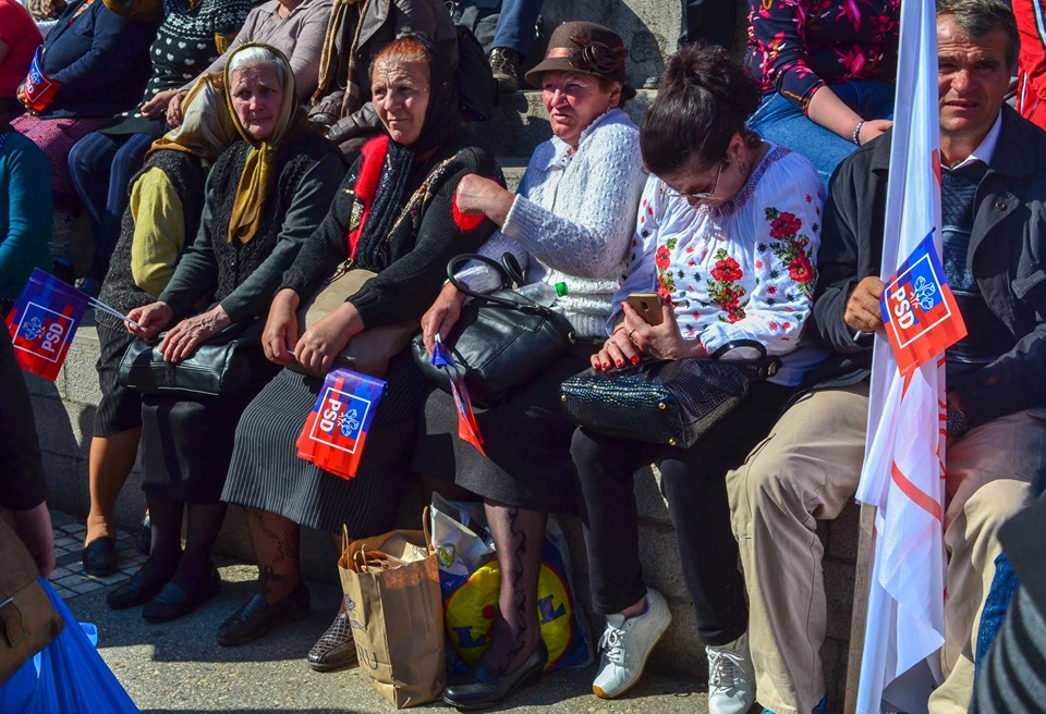 Din pas în pas, oamenii pe care-i vezi încep să difere. Dacă doi bărbați duhnind a alcool și-au făcut puțin loc în jur și se învîrt în pași de dans, alții vorbesc despre numărul protestatarilor aduși din Bacău și se contrazic, iar cîteva femei, care par sleite de puteri, stau așezate pe un colț liber de bordură. Pe jos, peste tot sînt bucăți de pancarte, sticle goale, coji de semințe și resturi de țigări. „Am venit singuri, așa, cu autobuzul, fără să ne organizeze cineva”, îmi zice un băiat de 17 ani din Bacău. „Îmi place PSD mult, dar nu știu acum să-ți zic exact de ce”, spune și mă asigură că face 18 ani peste o lună, cînd ar vrea să se și ducă la vot, dacă or să-i vină actele la timp. „Da’ nu mai vorbi atîta cu el, vorbește cu mine!”, îmi zice un bărbat în vîrstă, care l-a auzit deja și-a încercat să-l tot acopere cu glume spuse pe-un ton mai ridicat. „Ce să știe, n-auzi că n-are nici drept de vot?”