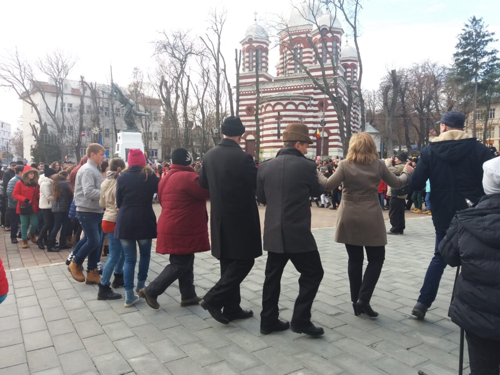 După depunerea coroanelor, în centrul tot mai mic al grupului reapar cîntăreții care dau tonul unui „Mulți ani trăiască”, ce pare mai degrabă o frîntură din slujba de Paște, cînd credincioșii îngînă ritmic „Hristos a înviat!” și își răspund, unul altuia, la fel de repede, „Adevărat a înviat!”. Ca prin minune, la gulerele gecilor de fîș apar stegulețe mici prinse cu agrafe care dau momentului un aer și mai solemn. Cei mai curajoși se prind repede în horă cînd repertoriul se schimbă și, în mai puțin de un minut, hora se învîte pe vreo trei rînduri, fiecare cu un ritm propriu.