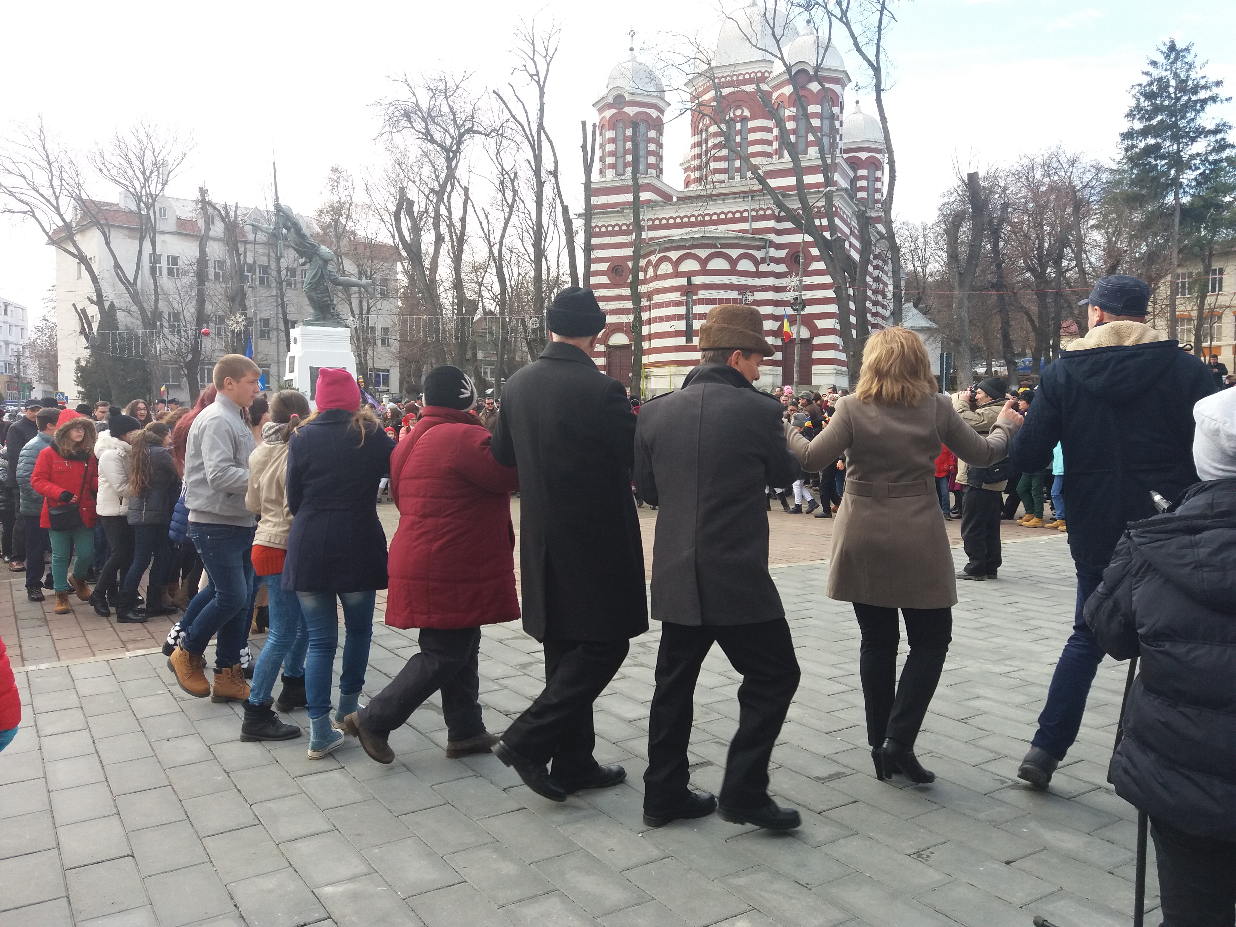 Joia trecută, ziua națională a prins orașul în plină sărbătoare, lăsînd să se vadă ghirlandele, instalațiile și steagurile proaspăt puse. Beculețele colorate, unele uitate de la Crăciunul trecut, stîteau lungite de pe o parte pe alta a aleilor. La colțuri, instalațiile erau acoperite de bucățile mari de material, pictate în roșu, galben și albastru, care lăsau să se înțeleagă comuniunea desăvîrșită, dar ușor nepotrivită, dintre festivitățile de iarnă și cele ale patriei. În fața primăriei vechi, redeschisă după șase ani de lucrări, s-au adunat vreo 200 de oameni, care s-au așezat, ca în urma unei înțelegeri tacite, într-un cerc perfect. În mijlocul acestora, printre stegulețe fluturînde, un sobor de preoți își frecau mîinile, printre cuvinte liturgice, în speranța că roșeața provocată de ger o să dispară. În balconul de deasupra ușii pe care se intră în primărie tronează un 2017 încă neaprins, iar un fotograf dă naștere cu o simplă apăsare de buton, unei rafale de blițuri, care doar-doar vor putea cuprinde în cadru pe toată lumea.