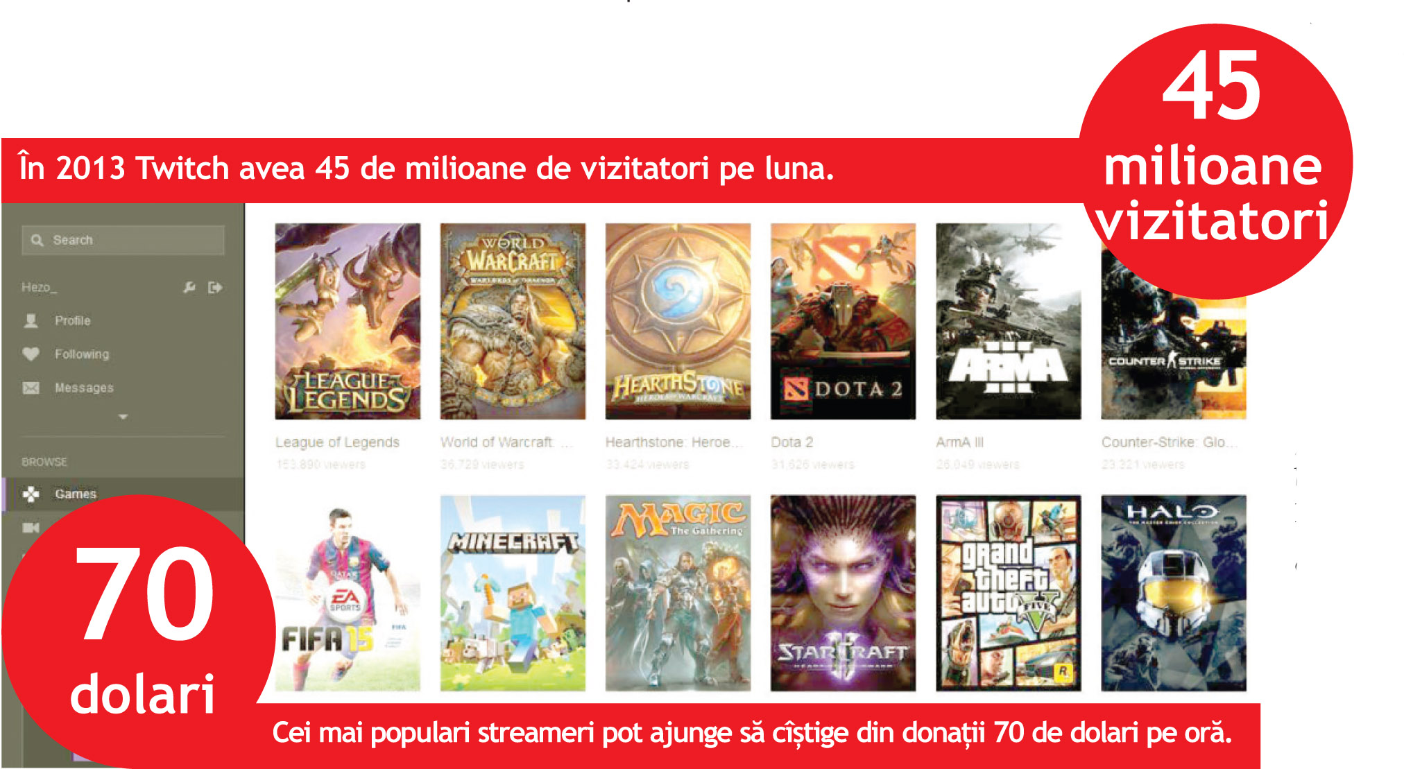 O cameră video, un calculator cît de cît performant și pasiune pentru gaming. Doar de atît au avut nevoie unii tineri precum Kripp, Trump sau Swifty să devină adevărate personalități în comunitățile de gameri și să cîștige îndeajuns cît să se întrețină doar butonînd toată ziua. Iar Twitch, care practic este un site unde oamenii intră să-i urmărească pe alții în timp ce joacă jocuri video, le-a oferit platforma perfectă pentru asta. Fie că e vorba de difuzarea de competiții ale sporturilor electronice cu milioane de dolari în joc, tineri cu personalități interesante ori acțiuni de caritate unde pasionații stau treji prin rotație chiar și trei zile la rînd pentru o cauză nobilă, Twitch i-a unit pe toți sub același steag – o religie a gamingului.